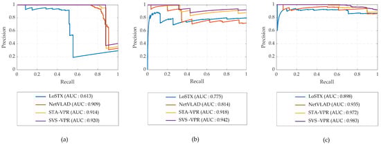 Precision–recall curves obtained for visual place recognition on Synthia dataset: (a) Spring–Summer; (b) Spring–Winter; and (c) Dawn–Night.