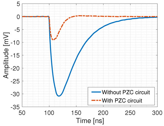 Figure 1. As an exemplary illustration showing the average signal of a single photo-electron signal obtained with the PM1125 SiPM before and after the PZC circuit. PZC reduces the signal duration from ∼150 ns to ∼35 ns.