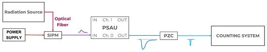 The SiPMs were interfaced with a single PMMA optical fibre (0.5 mm diameter) with a scintillating YVO tip. In the prototype being commissioned, the signal by the SiPM was amplified (36 dB) by the CAEN SP5600 Power Supply and Amplification Unit (https://www.caen.it/products/sp5600e/, accessed on 31 July 2023), providing a single photo-electron (p.e.) signal peak amplitude in the 15–30 mV range, depending on the SiPM being considered.. To reduce the impact of piled-up events, the amplified signal was filtered by a detector-customised passive Pole-Zero Cancellation (PZC) circuit to reduce its duration (Figure 1). Finally, the signal was fed to a pulse counting unit to measure the rates. The schematic configuration of the system is shown in Figure 2.