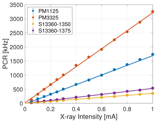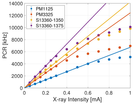 • Sensitivity, defined as the minimum variation of the X-ray current (I) that induces a change in PCR exceeding three standard deviations σ of a single measurement ( Δ P C R 3 σ ). In the linear regime, it may be written as