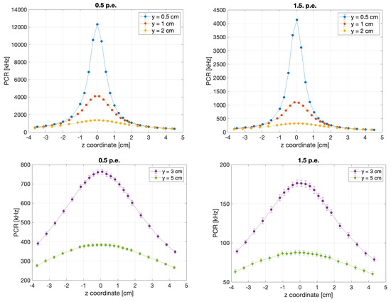 Figure 6 shows the measured curves for the PCR against the z-coordinate of the source. The measurements have been acquired with two detection thresholds (0.5 p.e., left panel, and 1.5 p.e., right panel) at different y-positions.