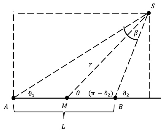 Figure 7. Geometry for the definition of G ( r , θ ) . r is the radial distance from the centre point of the seed (M) to the point of interest (S), θ , θ 1 , θ 2 and β are the angles of interest, with the first being the azimuthal angle. A and B represent the endpoints of the source, and L is its total length.