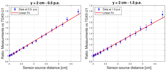 The non-water equivalence of the scintillator was studied through the ratios between the normalised experimental data and the corresponding theoretical predictions versus the source-sensor distance, obtaining the energy correction curves. Exemplary results for the sensor positioned at 2 cm from the source tunnel for both counting thresholds are shown in Figure 8, featuring the expected linear trend and confirming TG43-U1 compliance [20,21,25] at the reported distance.