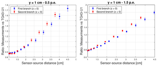 However, for the plots obtained with the sensor closer to the source tunnel (y = 1 cm), the curves display a clear non-linear trend (Figure 9), resulting from the superposition of two effects: piled-up events and the “stem effect”. The latter is associated with two processes: Cherenkov light produced by the impinging radiation on the fibre and photoluminescence induced by the same Cherenkov light on the scintillating material [20,21]. The impact of piled-up events is clearly visible comparing the left and right panels of Figure 9, where the measurements at 0.5 p.e. and 1.5 p.e. are shown. At the higher threshold, where the counting rates are smaller by about a factor 3, linearity at the smallest source-sensor distances is almost fully recovered. However, even at 1.5 p.e. threshold, some degree of non-linearity persists and notably the energy dependence curves splits into two branches, due to the “stem effect”. In fact, since the acceptance of the fibre to the radiation field does depend on the source position along z, the impact of Cherenkov radiation induced effects is expected to be asymmetrical with respect to z = 0, with a larger effect at negative z values (Figure 5). Nevertheless, the use of Cherenkov light filters positioned in front of the detector and possibly in front of the scintillating material was shown to solve the issue in [20,21,26] and it will also be implemented for the ORIGIN system, targeting the recovery of TG43-U1 compliance over the full range of y-values.