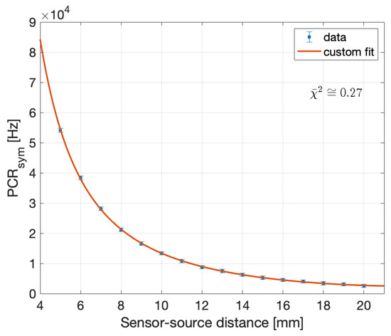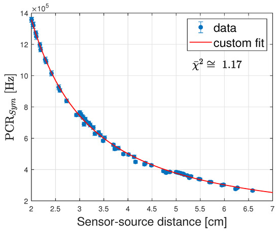 Since the model function fits the data well, the fit can be reasonably relied upon to extrapolate the P C R S y m trend at 10 cm (where de facto, coincides with the PCR), for a value of 27 ± 3 kHz, well in excess of the required specifications (MDR of 1.5 ± 0.1 kHz as of Table 4). Furthermore, by relying on the verified Poissonian hypothesis, the Statistical Precision (1) may be written as