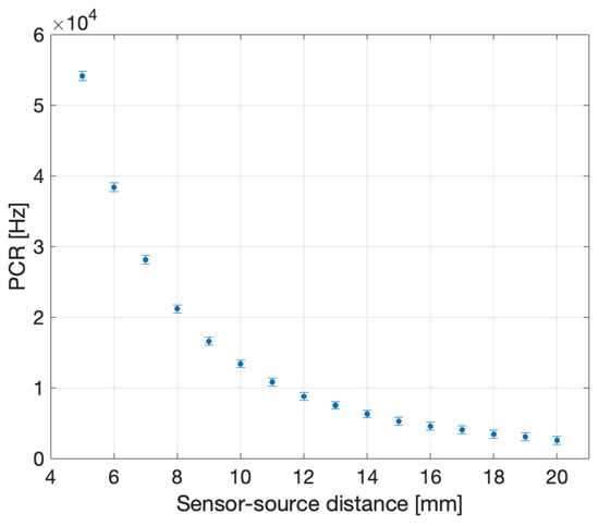An LDR measurement study was performed at the Radiotherapy Department of the Galway Clinic (Galway, Ireland). The results were obtained with the S13360-1375 SiPM and the Gadox fibre (0.5 mm diameter) irradiated by an 125I source of 0.3 mCi activity. The measurements were carried out using a PTW MP3-XS water phantom system (PTW, Freiburg, Germany), coupled with a 3-D printed source and sensor holders made from polymer-like material with a density of 1.17–1.18 g/cm3 [27]. Figure 11 shows the schematic of the setup. The 125I radioactive seed was introduced into the water tank, aligned with respect to the fibre dosimeter, and then moved along the radial direction with steps of 1 mm (precision of 0.1 mm) from 5 mm up to 20 mm. DCR runs were taken and subtracted to all the measurements to obtain the PCR. Figure 12 shows the PCR as a function of the sensor-source distance.