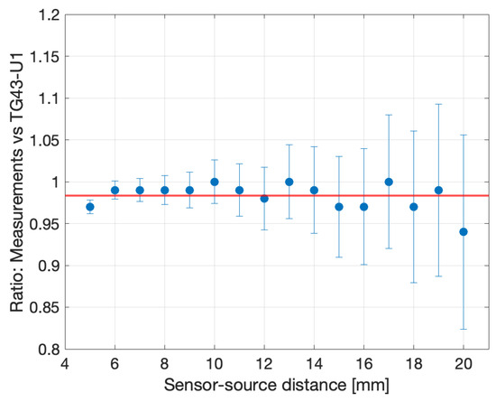 Because of the low-energy radiation typically emitted by LDR sources, energy correction is not expected to be required [27] and the data support this, as shown in Figure 13, where the ratios between the dose-rate-normalized PCR and the TG43-U1 predictions are displayed.
