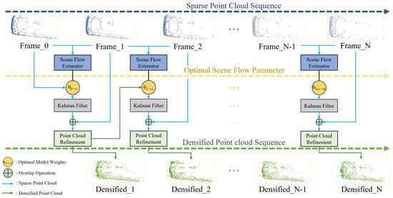 where denotes the scene flow estimation model and represents the model weights. Scene flow estimation is performed for each pair of point cloud frames in the sequence , sequentially calculating the optimal scene flow model weights .