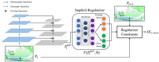 We have developed a two-branch pyramid network to serve as the model for the scene flow estimator, as illustrated in Figure 2. Frame is initially inputted into a pyramid feature extractor, which comprises a bottom-up and top-down pathway for the point cloud. The number of sampling layers is configured as 4 for both the bottom-up and top-down pathways, while the scale rate is set to 2. The output of each downsampled layer will be combined with the results of the upsampling layer and passed as input to the subsequent layer for the next upsampling operation. The final output, noted as , is fed into an implicit regularizer for optimization.
