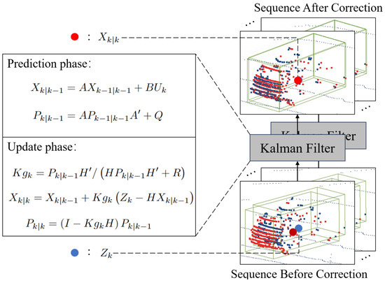To eliminate the cumulative localization error of point cloud during the long sequence estimation process, the Kalman filter [49] is introduced to correct the dynamic targets’ position.