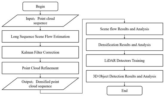 In this section, we provide a detailed description of the parameter settings used in the scene flow estimation model, along with the hardware and software configuration employed. In the second part, we have finetuned our model on the KITTI scene flow dataset and compared our method against other state-of-the-art scene flow estimation techniques. Next, we proceed to compare the proposed method with the ICP algorithm in terms of the densification outcomes. For the purpose of conducting a comprehensive analysis, we have employed five distinct LiDAR detectors to assess their performance. This evaluation was carried out on both the raw and densified KITTI tracking dataset. The overall methodology and sequential analysis steps in our approach are summarized in Figure 5.