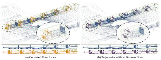 To further substantiate the efficacy of our scene flow estimatior, particularly emphasizing the improved localization accuracy provided by the Kalman filter, we include a set of visualization results. Figure 6 concretely demonstrates the scene flow estimation over extended sequences, revealing the trajectories and point cloud data before and after Kalman filter correction. Figure 6a,b illustrate the marked contrast in trajectory prediction and point cloud localization with and without the use of the Kalman filter. In Figure 6a, we observe the corrected trajectories that exhibit high coherence and precision, affirming the filter’s role in enhancing localization accuracy, especially in complex urban and highway scenarios. Conversely, Figure 6b highlights the discrepancies and increased localization errors when the Kalman filter is not employed. The bottom sections of both figures provide a clear side-by-side trajectory comparison, with the corrected paths presenting a compelling case for the Kalman filter’s impact. These visual comparisons not only bolster the quantitative results but also deliver qualitative, intuitive confirmation of our model’s improved performance in dynamic settings. The enhanced flow coherence and diminished error presented in these visual outcomes effectively address the reviewer’s call for more robust visual evidence, thus substantiating our claims of superior scene flow estimation capabilities.