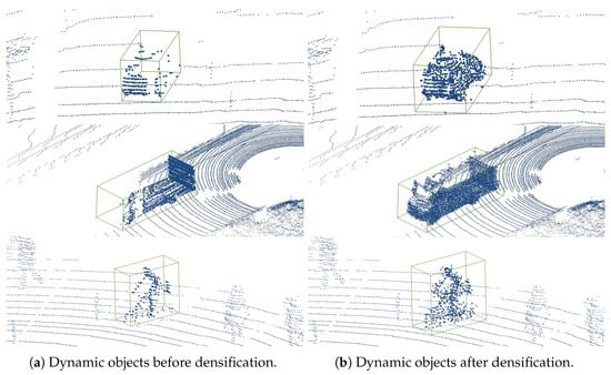 Densification results: (a) demonstrates dynamic objects before densification; (b) demonstrates dynamic objects after densification. The proposed method effectively provides more semantic and structural information than the raw point cloud.