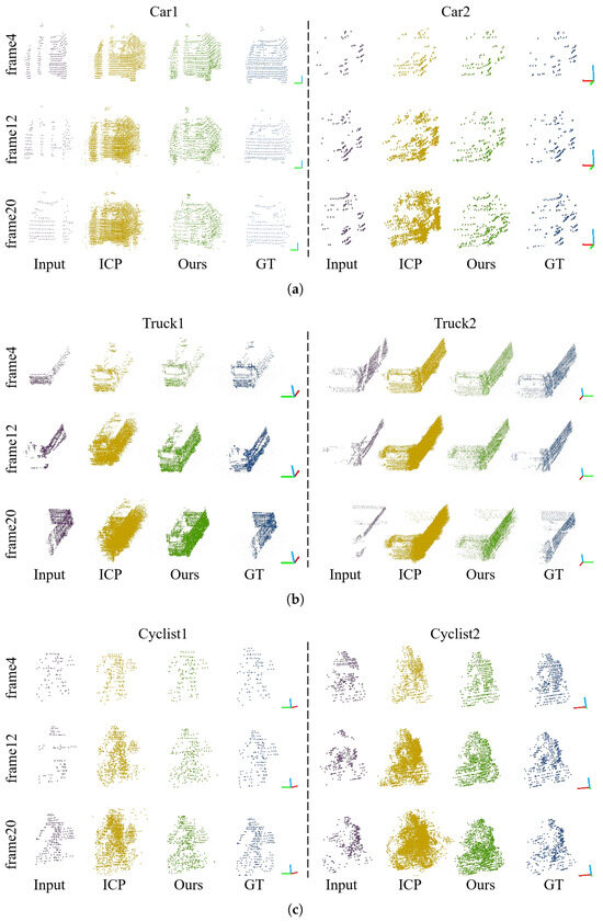 The proposed method and the ICP algorithm are utilized to analyze the dynamic targets that have been segmented from the KITTI tracking dataset. The qualitative comparison results are illustrated in Figure 8. Based on the analysis of the experimental results, it is apparent that our method successfully maintains the shape of the densified point cloud while minimizing the occurrence of noise points.