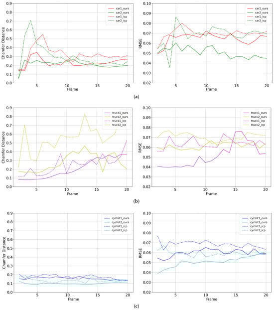 The densification experiments are particularly focused on mobile entities like cars, trucks, and cyclists because these entities typically exhibit significant movement and variation in point clouds, presenting unique challenges in terms of densification and accuracy. To disrupt the structure of the raw point cloud, we employ random cropping. Subsequently, we evaluate the performance of our proposed method and the ICP algorithm on these data by conducting a comparative analysis.