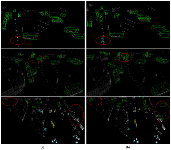 Qualitative comparison of the 3D object detection results: (a) the left column shows the results from the PV-RCNN detector trained on the three-frame densified dataset; (b) the right column shows the results from the PV-RCNN detector trained on the raw dataset. The boxes in the diagram are green for car, light blue for pedestrain, and yellow for cyclist. Our proposed method effectively reduces the false positive detection in general scenes, as illustrated by the red circles highlighting the detection differences between datasets.