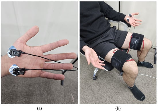 In Experiment 1, 13 adults (11 males, 2 females, 24.8 ± 0.7 years old, 174.5 ± 6.0 cm, 72.9 ± 14.2 kg) were tested. Pneumatic cuffs were worn on both thighs to provide pressure stimulation, and Ag/AgCl electrodes were attached to the thumb and cubital fossa of the left palm to measure EDA signals (Figure 1a) [13]. The experiment was conducted in a sedentary state. To prevent the subject’s adaptation to the experiment, three different pressures of 10, 20, and 30 kPa were randomly applied to the pneumatic cuff on the right thigh for 1 min each. A VAS was obtained after each pressure was removed, and a 5 min rest period was given to the subjects.