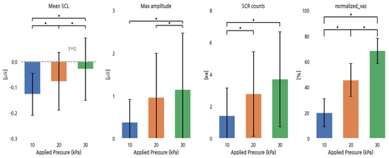 Figure 3 shows the response of EDA parameters and the normalized VAS to increases in pressure. The mean SCL and the normalized VAS significantly increased with increasing pressure. The max SCR amplitude showed no significant increase between 10 and 20 kPa, and SCR counts did not significantly increase between 20 and 30 kPa, while others significantly increased.