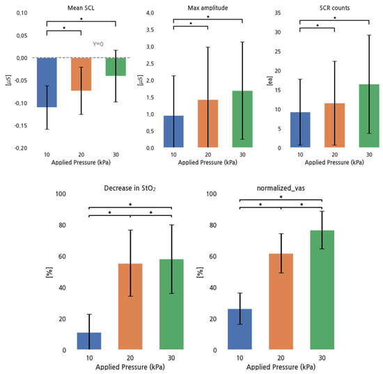 Figure 4 shows the response of EDA parameters, the decrease in StO2, and the normalized VAS for pressure increases. All EDA parameters increased with increasing pressure, except for the group between 20 and 30 kPa, while the decrease in StO2 and the normalized VAS increased in all conditions.