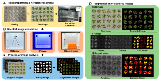 RGB, chlorophyll fluorescence (CF), and IR thermal images were acquired after herbicide treatment and analyzed using MATLAB R2023b (The MathWorks Inc., Natick, MA, USA).