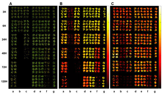 RGB (A), CF (B), and IR thermal (C) images of crabgrass at 3, 6, 24, 48, 72, and 120 h after treatment of herbicides: (a) glyphosate (EPSPS), (b) paraquat (PSI), (c) tiafenacil (PPO), (d) isoxaflutole (HPPD), (e) penoxsulam (ALS), (f) glufosinate (GS), and (g) untreated control.