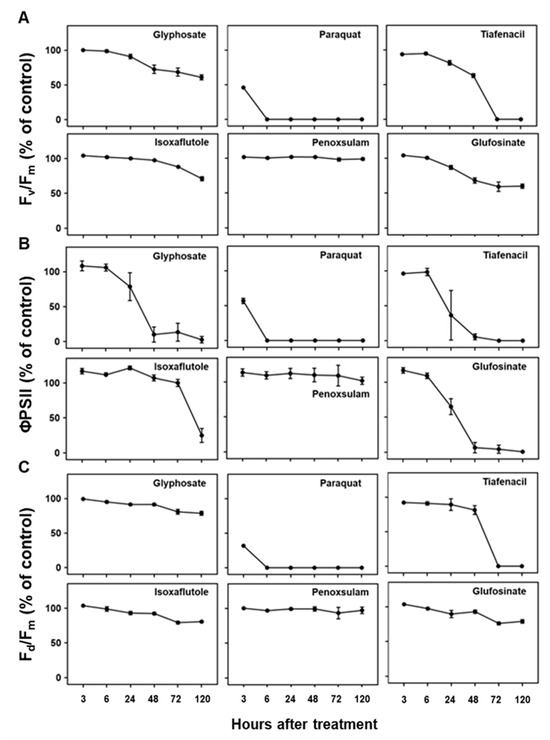 Changes in chlorophyll fluorescence parameters, including (A) Fv/Fm, (B) ΦPSII, and (C) Fd/Fm, over time after treatment of herbicides with different modes of action.