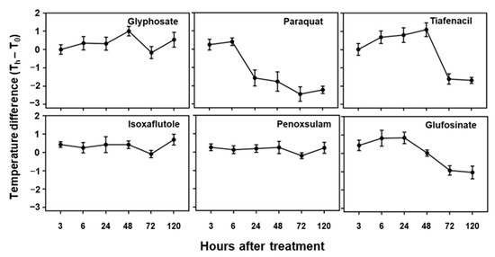 Changes in temperature difference over time after treatment of herbicides with different modes of action.