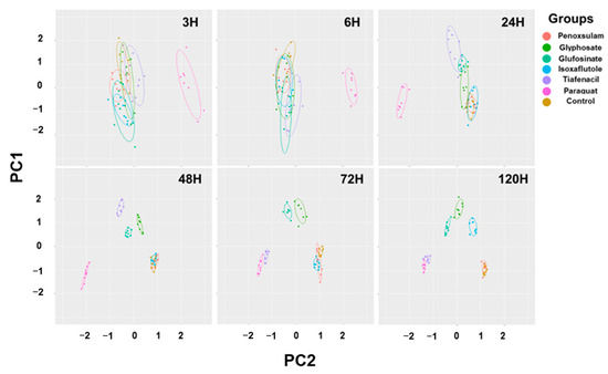 PCA results of six spectral parameters of crabgrass observed at 3, 6, 24, 48, 72, and 120 h after herbicide treatment with different modes of action. Each symbol represents a replication.