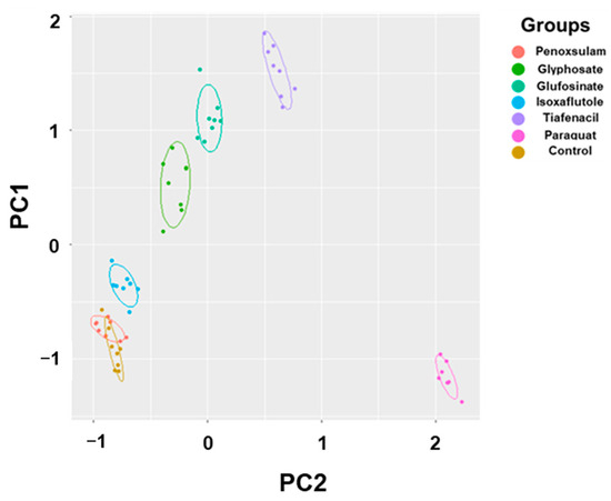 PCA results of six spectral parameters of crabgrass by aggregating all of the data, including 3 h, 6 h, 24 h, 48 h, 72 h, and 120 h after treatment of herbicides with different modes of action. Each symbol represents a replication.
