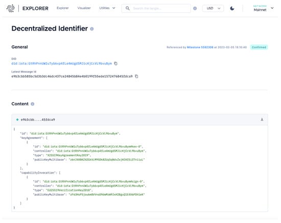 Using this approach, the DID Document (Figure 3) is formatted as an integration DID message, signed using the same keypair used to generate the tag, and published to an IOTA Tangle on the index generated out of the public key used in the DID creation process. All private keys or seeds used for the did–iota method should be equally well protected by the users and sensors. The signing key is especially important as it controls how keys are added or removed, providing full control over the identity. Consequently, the utilization of DIDs in identifying sensors becomes imperative, ensuring a protective framework that strengthens security and fosters reliability in the system.