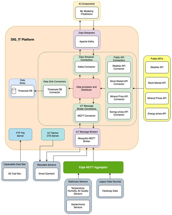 The platform stores data from multiple data sources and sends them to multiple data destinations. All data are stored in a central location and can be accessed by the rest of components and users. Figure 4 summarises the high-level architecture of the platform, and its basic building blocks. The architecture represents a fundamental example of the IoT project that collects various types of data from the processes in the mines, which is why it is used as an example in this study. As shown, the platform consists of advanced components as an MQTT broker, an Apache Kafka (integrated with machine learning modelling, -ML-, and user Interface -UI-), Timescale DB, data connectors (data streamers, data sink, IoT message broker connectors), OTA servers for garment updates, and FTP servers.