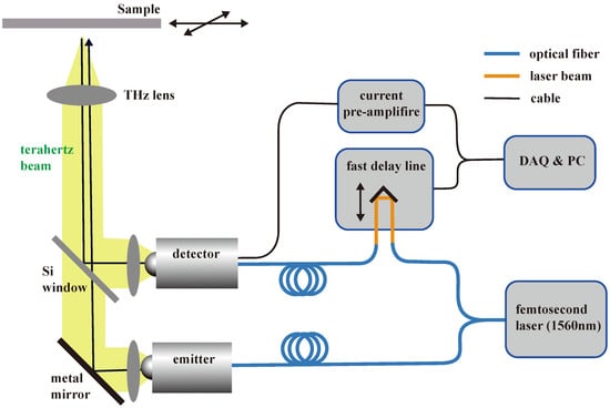 We used a reflection-mode THz imaging system to acquire images and THz waveforms, as shown in Figure 1. The THz pulse was obtained using a femtosecond laser and a photoconductive antenna. The femtosecond laser had a central wavelength of 1.5 μm and a pulse width of 80 fs. A fiber-coupled antenna (TERA15-TX-FC, Menlo Systems) was used as a photoconductive antenna for THz pulse generation, and another fiber-coupled dipole antenna (TERA15-RX-FC, Menlo Systems) was used to detect the THz signal. To rapidly acquire the THz signal, we used an ultra-fast scanner with frequency and time-width settings of 20 Hz and 30 ps, respectively.