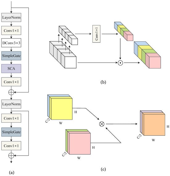 Description of building block used in J-Net. (a) Baseline block used in J-Net; (b) simplified channel attention (SCA) module; (c) simple gate.