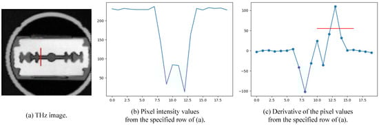 We randomized the standard deviation  value of the Gaussian blur between  and . We show qualitative and quantitative results for different values of  and . The range for the alpha and beta values was determined based on the actual full width at half maximum (FWHM) measurements used to estimate the point spread function (PSF), as illustrated in Figure 5. For accurate measurement of the PSF, it is necessary to examine the cross-sectional image of the object taken at a right angle. In our work, we focused on the central gap of the blade, highlighted by the red line in Figure 5a, and present the cross-sectional image of this gap in Figure 5b. Following this, Figure 5b was processed to derive Figure 5c, in which the PSF is modeled as a Gaussian distribution, enabling the estimation of its standard deviation. Although the precision of this estimation is somewhat constrained by the limited pixel count within the blade’s central gap, it still provides sufficient information to establish a range of standard deviations for use in our experiments. The estimated standard deviation value of the PSF, assumed to be a Gaussian distribution in Figure 5c, is 0.7. In Table 2, the smaller the difference between alpha and beta, the higher the PSNR value, and if the difference is the same, the PSNR is higher for higher alpha–beta values. You can see that the PSNR is significantly higher when alpha is 0.1 than when it is 0. Figure 6 shows the inference results using the model in the table: (a) is the original and the rest are the results of doubling the image resolution compared to the original image. Note the smoother boundaries compared to the original. It can be seen that the results for  all tend to follow the noise of the original image, while for  the noise is smoothed out. At an alpha of 1, the results do not seem to fully reflect the PSF of the THz system. Therefore, it is important to choose appropriate values for  and .