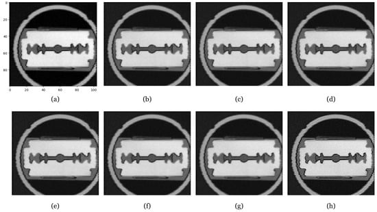 Experimental results on real THz image of metal knife. (a) Original THz image obtained at a frequency of 1.0 THz; (b) ; (c) ; (d) ; (e) ; (f) ; (g) ; (h) .