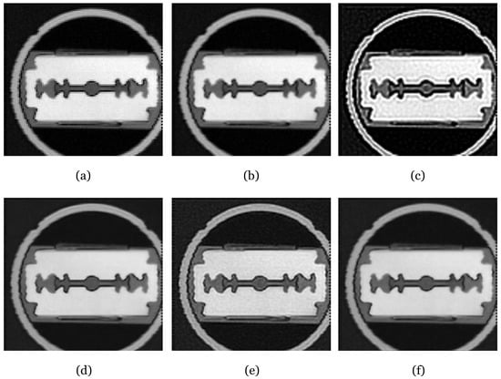 Experimental results on real THz image of metal knife. (a) Original THz image obtained at a frequency of 1.0 THz; (b) bicubic interpolation; (c) Lucy–Richardson deconvolution; (d) Long et al. []; (e) Ruan et al. []; (f) J-Net.