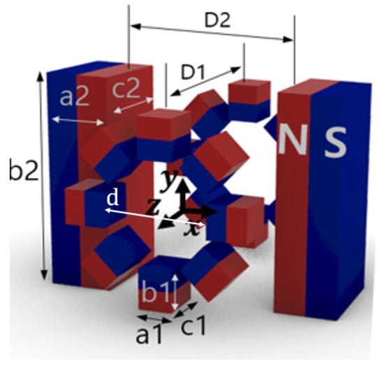 Configuration of the proposed FFL generator (d: inner diameter of Halbach ring, D1: distance between Halbach ring pair, D2: distance between bar-shaped magnet pair, [a1, b1, c1]: dimensions of small magnets of Halbach ring, [a2, b2, c2]: dimensions of bar-shaped magnets).