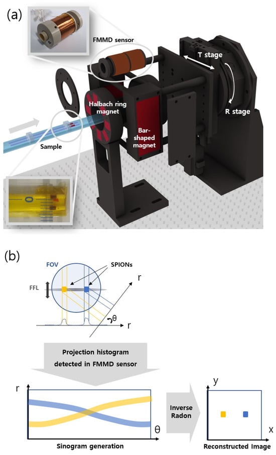 Mechanically driven FFL-MPI was realized with rotational and translational stages (Namil Optical Instruments Co., Incheon, Republic of Korea). The excitation and detection of superparamagnetic iron-oxide nanoparticle (SPION) signals were evaluated based on the frequency mixing magnetic detection (FMMD) technique [6]. The experimental setup for MPI is shown in Figure 2. The Halbach array pair is mounted on the optical table, and the bar magnet pair is mounted on the rotational and translational (R&T) stages. The linear stage moves the sample into the FFL position inside the FMMD sensor. Signal generation and detection are carried out using an FMMD sensor reported previously [19,20]. The measured signal generates a sinogram, while the FFL scans the sample translationally and rotationally. Then, the sinogram data can be reconstructed into 2D images via the inverse Radon transform. The SPIONs used for the MPI sample were Synomag-D (product no. 104-00-501) from Micromod (Rostock, Germany). These nanoparticles have a diameter of 70 nm, a plain surface, and a concentration of 25 mg/mL. A thin capillary tube was filled with the SPIONs. The outer and inner diameters of the tube are 1.5 mm and 1.2 mm, respectively.