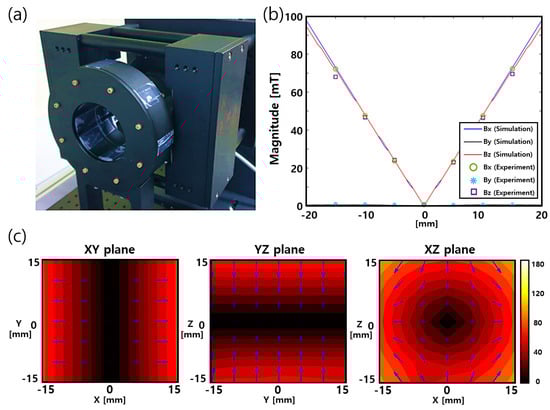Figure 3a shows a photograph of the constructed FFL device. The magnets are positioned in an aluminum casing in accordance with the simulation dimensions listed in Table 1. The FFL generator and all casing components, such as bolts, are constructed from nonmagnetic materials, such as aluminum, so that the generated FFL magnetic field is not interfered with. The magnetic field was measured using a Hall-effect sensor positioned on a 3D moveable robotic arm. Figure 3b shows a comparison of the measured magnetic field along the x, y, and z axes with the simulation results. The scanning area was [–15 mm, 15 mm] along each axis at 5 mm intervals. The measured contour map is shown in Figure 3c. The measured data correspond closely with the simulation results.
