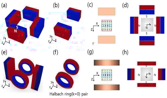 Comparison of quadrupole magnets and the proposed FFL generator: (a) quadrupole magnets, (b) square magnet pair, (c) magnetic field of square magnet pair, (d) magnetic field of quadrupole magnet, (e) proposed FFL generator, (f) Halbach ring pair, (g) magnetic field of the pair of Halbach rings, (h) magnetic field from the proposed FFL generator.