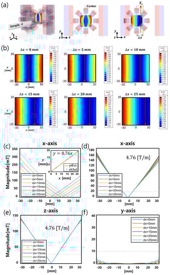 Linear movement of the FFL and gradient strength: (a) translation movement of the bar magnet pair, (b) contour map along the x-y plane, magnetic strength along the (c,d) x axis, (e) z axis, and (f) y axis while the bar magnet pair is displaced (∆x) from 0 mm to 25 mm.