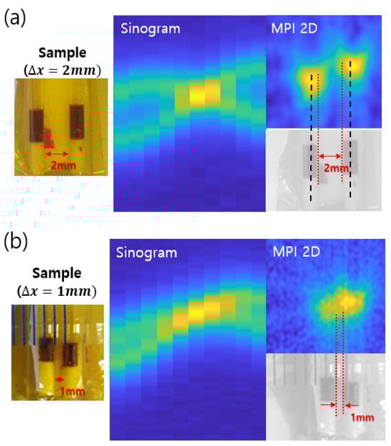 MPI results with sample distance (∆x) of (a) 2 mm and (b) 1 mm.