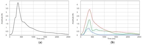 We actuated the controller a total of ten times under these conditions, subsequently averaging the collected data prior to further calculations. The readings were processed through a Butterworth low-pass filter with a cut-off frequency of 50 Hz. Following this, we calculated the force magnitude using the formula: