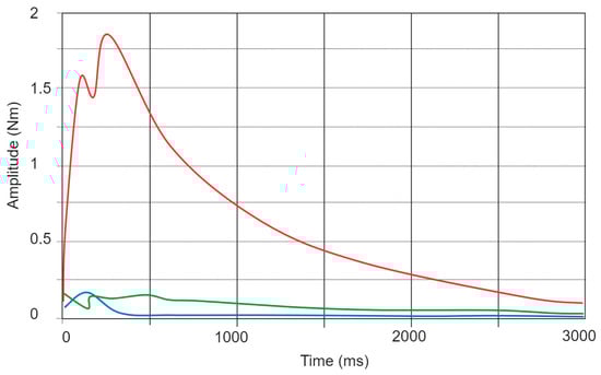 Output torque resulting from suddenly stopping the flywheel while it is rotating at full speed. Axes illustrated as follows: X (red), Y (green), and Z (blue).