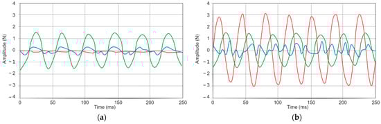 The first approach had the advantage that it was easier to control and was capable of higher frequencies of vibration before the motors started to drift. The vibration generated has a clear directional property, aligned tangentially to the rotation axis, which provides clear directional cues. Figure 6a shows the measured output from this actuation. However, the feedback’s magnitude is comparatively lower than the second approach. In the second approach, activating the flywheel during the vibration pattern generation resulted in a higher magnitude output force. However, due to the limitations of the motors used to actuate the gimbals, when the flywheel was rotating at full speed, we could not achieve patterns higher than 25 Hz before the motors began to drift. Furthermore, in this scenario, the vibrations exhibited multi-component torque, as shown in Figure 6b.