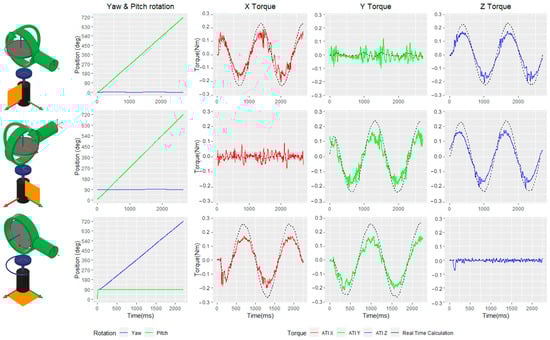 To determine the maximum output torque of HapticWhirl, we programmed the flywheel to rotate at its maximum speed of 12,000 RPM while concurrently actuating the pitch gimbal at its peak speed of 800 RPM. To minimize potential external disturbances during the experiment, we secured the yaw axis (Z-axis) and only permitted rotation on the pitch axis (Y-axis). The flywheel’s orientation was actuated between −60 and 60 degrees, where the home position (0 degrees) corresponds to the disk rotating horizontally while the controller remains upright.
