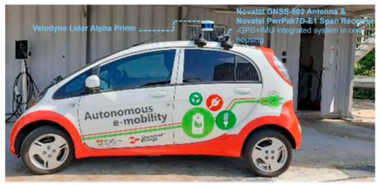 Figure 2 shows an overview of the hardware configuration of the Connected Automated Vehicle (CAV) platform built by the NTU CETRAN group. The vehicle-based demonstrator is setup on a Mitsubishi iMiev (Mitsubishi Motors Corporation, Tokyo, Japan), and the primary components include an IPC processor that serves as the main processing unit, running the Baidu Apollo Automated Driving System (ADS) (Baidu, Beijing, China) on an Ubuntu 20.04 LTS (Canonical, London, United Kingdom). For sensing and localization, the vehicle is equipped with a Velodyne Alpha Prime (VLS-128) LiDAR sensor (Velodyne Lidar, San Jose, United States), which has 128 beams and provides a 360-degree horizontal and 40-degree vertical field of view (FOV), scanning the surroundings at a frame rate of up to 20 Hz. This LiDAR is calibrated to the vehicle’s local coordinate system using manual measurements with respect to the vehicle’s reference frame. Furthermore, the vehicle includes a Novatel PwrPak 7D-E1 GNSS (NovAtel, Calgary, Canada) receiver combined with an inertial measurement unit (IMU), offering precise localization and speed data. The GNSS system is augmented by a Novatel GNSS 502-Antenna (NovAtel, Calgary, Canada) and a Real-time Kinematic (RTK) correction service that uses Singapore Land Authority’s SiReNT service for improved accuracy.