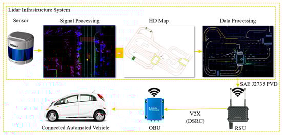 The LiDAR Infrastructure System (LIS) (Autonomous a2z, Anyang-si, Korea) was developed by Autonomous a2z, which is an autonomous driving solution provider from South Korea. The LIS aims to enhance public road safety and facilitate traffic management as part of the Cooperative Intelligent Transport Systems (C-ITS). It provides a next-generation traffic service based on real-time data from a LiDAR sensor. As shown in Figure 1, the LIS consists of a road-side LiDAR (HESAI Pandar 40P) (Hesai Technology, Shanghai, China) for perception, a computer (VECOW SPC-5000) (Vecow, Taipei, Taiwan) with artificial intelligence software to integrate perceived information with a high-definition (HD) map, and a V2X Roadside Unit (RSU) radio (Cohda Wireless, Wayville, Australia). The LiDAR detects vehicles and pedestrians, the edge device processes the raw sensor data, and the RSU radio broadcasts the detection results to the CAVs. The vector mapping technology and localization algorithm in the HD mapping system enable rapid processing with minimal latency to the final terminal, such as a traffic control center or Onboard Units (OBUs) in vehicles.