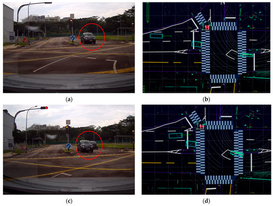 The road user detection and tracking in the right-turn scenario. In (a,b), the CV could “see” through the vehicle a visually occluded vehicle (labeled with red circles) with the help of the LIS. This occurred seconds before the CV drove closer and could observe by itself the previously occluded vehicle, as illustrated in (c,d).