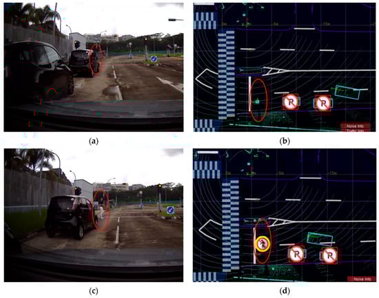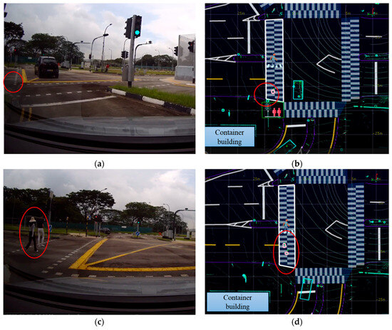 The left-turn scenario in this research was designed to simulate the “urban canyon” effect, a common urban environment wherein tall buildings at street corners can obscure pedestrians from the field of view of a CV. In Figure 6a,b, the CV demonstrated an advanced ability to “see” through these obstructions. With the assistance of sensing data received from the LIS, the CV could detect two pedestrians who were visually occluded by the corner building, as indicated by red circles in the figure. Notably, in Figure 6a,c, due to the limited field of view of the vehicle’s front-right camera, the container building located to the front left of the vehicle was not captured. However, it was detected by the LIS and can be seen in the bottom left corner of Figure 6b,d.